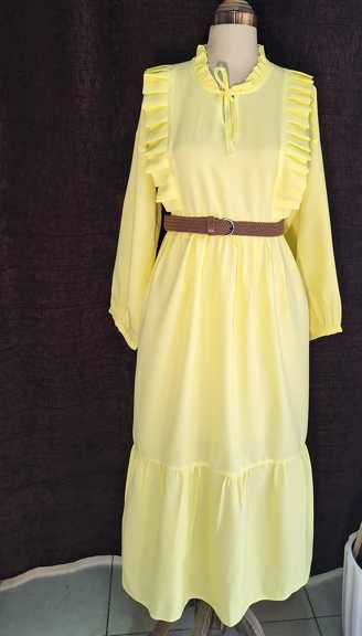 پیراهن مجلسی بلند قد 140cm, دور سینه 120cm, قد از گردن تا مچ 68cm, نوع پارچه کرپ اسکاچی, کمربنددار , در دو رنگ ابی و زرد کره ای